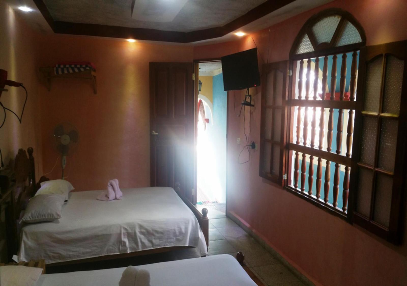A quiet and intimate room, with two double beds, air conditioning, fan and private bathroom. It has access to the outdoor terrace and the panoramic roof terrace. It is located on the first floor (there are stairs) and is suitable for families.